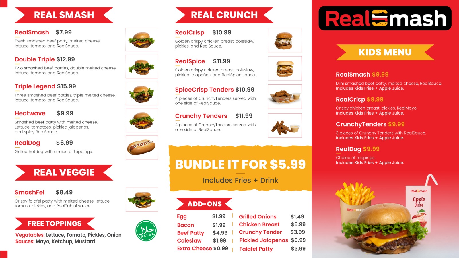 At Real Smash, every burger starts with 100% fresh, halal beef — smashed to perfection for that crispy edge and juicy bite you crave. Our menu is built around bold flavors, real ingredients, and a love for authentic street-style burgers. Whether it’s our signature RealSmash Burger, HeatWave Burger, or RealCrisp Chicken, each one is made fresh, fast, and full of flavor