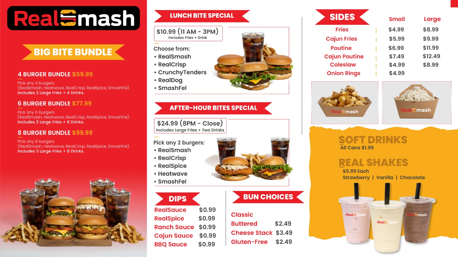 From juicy beef patties to golden falafel and crispy chicken, we take Windsor’s favorite comfort foods and give them the Real Smash twist — fresh ingredients, real taste, and zero shortcuts.